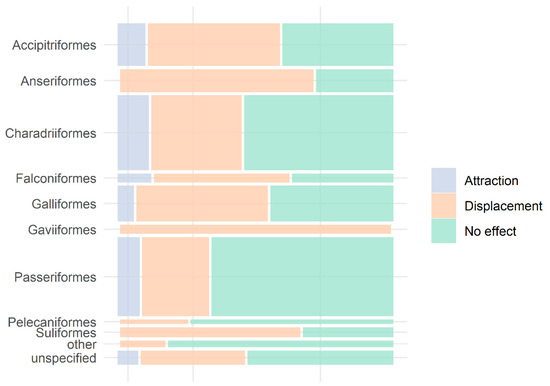 There is evidence of displacement, but also attraction, for the most studied groups. Displacement effects were reported for the majority of the trials involving Gaviiformes (100%), Anseriformes (68.2%), Suliformes (66.7%), Accipitriformes (48.7%) and Falconiformes (50.0%). Although not prevalent, attraction effects were observed mostly in Falconiformes (12.5%), Charadriiformes (11.6%) and Accipitriformes (10.3%); but never observed in Anseriformes, Gaviiformes, Pelecaniformes and Suliformes. On the other end, the lack of effects was prevalent in Pelecaniformes (75%), Passeriformes (66.2%) and Charadriiformes (55.1%) (Figure 5, Table 1). Galliformes had a similar frequency of trials with evidence of displacement (48.5%) and with the absence of effects (45.5%). We highlight that Falconiformes, Gaviiformes and Pelecaniformes were studied in a low number of trials/studies, so their results should be considered preliminary.