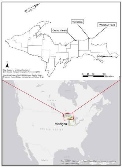 This study was performed during the 2018 breeding season where five pairs nested at three locations, Vermilion (N46.763080, W-85.150961), Whitefish Point (N46.769686, W-84.959219), and Grand Marais (N46.676257, W-85.983728) Michigan, USA (Figure 1). The three locations represent known breeding areas along Michigan’s Lake Superior shoreline and contain sparsely vegetated beach with cobble substrate. Vermilion is a remote nature preserve with relatively few visitors (estimate 0–30/day) during the breeding season compared to the other sites and had one breeding pair that made two nest attempts. Whitefish Point is a part of the Seney National Wildlife Refuge and site of the Whitefish Point Shipwreck Museum which experiences light to heavy tourist activity (estimate 50–2000/day) throughout the breeding season and had one breeding pair. Grand Marais is a small town with a residential beach having both public and private access and experiences local residential use in addition to varying tourist activity (estimate 0–200 people/day) throughout the breeding season and had three breeding pairs.