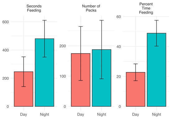Piping plovers spent more time engaged in foraging activity at night (480.4 ± 130.4 s) than during the day (246.2 ± 105.5; p = 0.023), made similar numbers of pecks to substrate between day and night (174.8 ± 89.1 and 187.8 ± 96.6, p = 0.877), and devoted a higher percent of time to feeding at night (Figure 3), indicating that foraging efficiency may have been decreased at night. Again, we were unable to detect differences within breeding phases after application of the Bonferroni correction (Table 1). Distance the plovers were found from nests was greater during the day (206.78 m ± 61.72 m) than at night (30.37 m ± 4.29 m) (Permutation test, S = −3.21, p = 0.011) (Figure 4), low samples sizes within breeding phases did not allow further assessment.