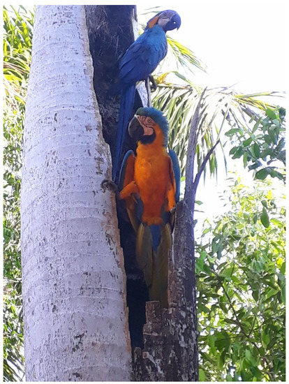 The question arises as to how we can turn cities in the Cerrado region into more biodiversity friendly places to help mitigate the devastation observed in this biome [12]. Much of the loss of the Cerrado biome results from deforestation and the transformation of land for agricultural purposes, which results in the loss of habitat and most importantly nest sites, for Blue-and-yellow macaws. The macaws nest in the tops of dead palm trees [8], and recently, they have started occasionally using dead palms in urban areas. Palm trees are occasionally planted by municipal authorities alongside roads, and as they mature and die, small numbers provide suitable nest sites [12].