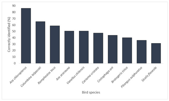 Percentage of individuals correctly identifying each of 10 bird species encountered in Rondonópolis.