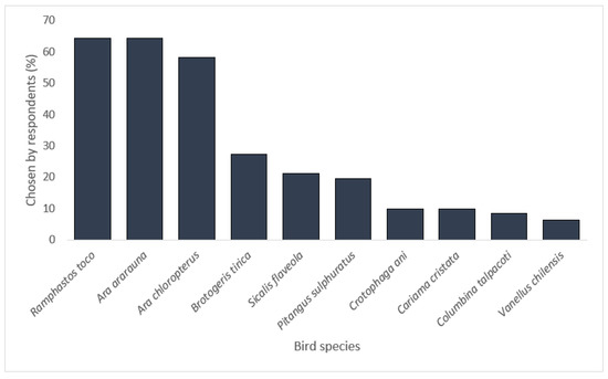 Percentage of individuals choosing each species as one of their three favorite birds in Rondonópolis.