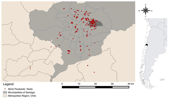 Briceño, C.; Larraechea, M.; Alvarado, S. Monk Parakeet’s (Myiopsitta monachus) Ecological Parameters after Five Decades of Invasion in Santiago Metropolis, Chile. Birds 2022, 3, 341-358. https://doi.org/10.3390/birds3040023