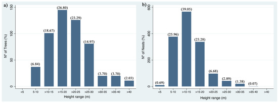 | Tree Species (Scientific Name) | N° of Trees with One or More Nests (%) | Mean Tree Height (SD) | Mean DBH (SD) | Mean Tree Canopy Diameter (SD) | Total N° of Nests | Mean N° of Nests/Tree (SD) | Max N° of Nests Per Tree |