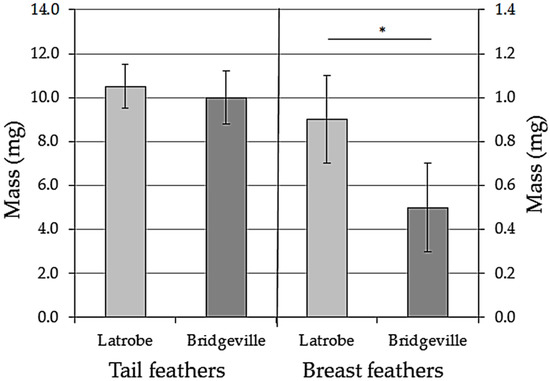 The breast feathers collected from both the Latrobe and Bridgeville groups were weighed after being washed in acetone. The weight values for the Latrobe feathers (0.9 ± 0.2 mg) were significantly higher than those of the Bridgeville sample (0.5 ± 0.2 mg; t14 = 3.11, p = 0.014; Figure 1).