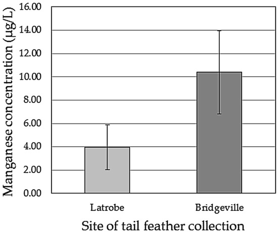 Given that the Tufted Titmouse tail feathers in our study averaged 0.01 g of dry weight, and each feather was digested and then diluted into a 15.0 mL sample, every 1.0 μg/L in concentration equals approximately 1.5 μg/g of dry feather weight. Thus, the content of Mn in the Latrobe feathers ranged from 2.9 to 11.9 μg/g, and the content of Mn in the Bridgeville feathers ranged from 6.6 to 23.0 μg/g.