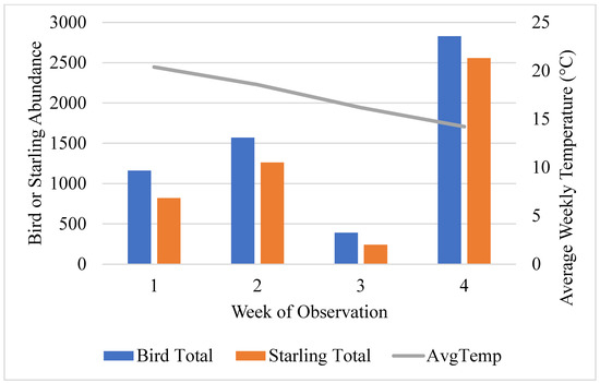 Changes in total bird and starling abundance and average weekly temperatures on Whatcom County dairies from mid-September through mid-October. Bird and starling abundance in Whatcom County, Washington from mid-September through mid-October 2016. Temperature is represented through average weekly temperature (°C). Week 1 was 17 September–23 September 2016. Week 2 was 24 September–1 October 2016. Week 3 was 2 October–8 October 2016. Week 4 was 9 October–16 October 2016.