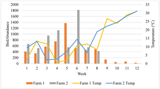 Starling abundance and temperatures at the time of bird abundance measurements at the KDC and UI dairies. Bird abundance from Knott Dairy Center at Washington State University in Pullman, Washington, USA (farm 1) and The University of Idaho Dairy Center in Moscow, Idaho, USA (farm 2), and the respective temperature (°C) on the day of bird abundance measurements, across 12 weeks (four consecutive weeks each in winter 2021 (weeks 1–4, mid-November–mid-December), spring 2022 (weeks 5–8, March), and summer 2022 (weeks 9–12, July)).