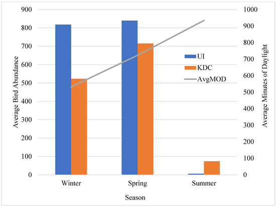 Average starling abundance and minutes of daylight in winter, spring, and summer at the UI and KDC dairies. Average bird abundance and minutes of daylight (AvgMOD) at the University of Idaho Dairy Center in Moscow, Idaho, USA and the Knott Dairy Center at Washington State University in Pullman, Washington, USA in winter (mid-November–mid-December 2021), spring (March 2022), and summer (July 2022). Each seasonal bird abundance average was calculated from four bird abundance measurements at each location. The seasonal minutes of daylight averages were calculated from the minutes of daylight on the eight days (four days at each location) of bird abundance measurements each season.