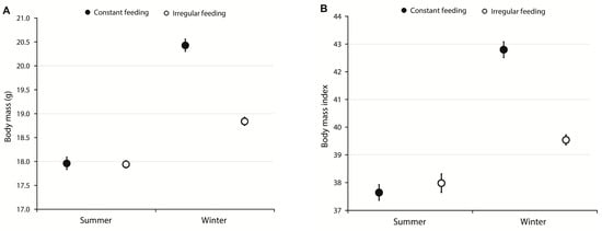 There was a significant difference in the average body mass measured in the summer and in the winter in the constant feeding group (paired t-test, t = −22.74, p < 0.0001), and there was a significant difference in this measure between the seasons in the irregular feeding group (paired t-test, t = −17.36, p < 0.0001). In both feeding groups, the birds were heavier in winter (Figure 1A). Additionally, there were significant differences in BMI measured in the summer and in the winter in both constant feeding and irregular feeding groups (paired t-tests, t = −29.76, p < 0.0001 and t = −6.3, p < 0.0001, respectively) (Figure 1B).