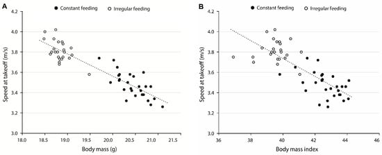 Relationships between (A) the average body mass and the speed at take-off, and (B) the body mass index (BMI) and the speed at take-off of male Great Tits from both constant (black symbols) and irregular feeding (open symbols) locations in winter.