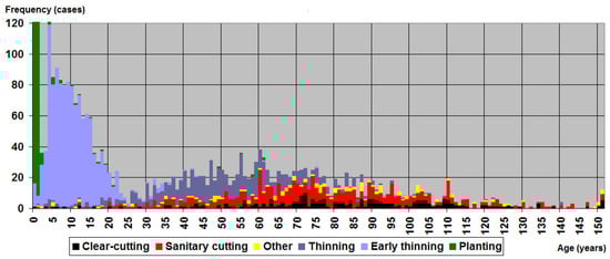 Frequency and intensity of logging operations around 117 Black Stork (Ciconia nigra) nests in Latvia from 1995 to 2018 show the lack of any “peace period” from logging over time, despite the existence of reserves intended to provide protection from logging operations. Data comprise 2438 forest compartments, with an average of 20.8 ha for each nest. The value of planting operations for age class 0 is 658.