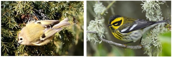 Examples of declining songbirds that require mature temperate and boreal forests to nest include the Goldcrest (Regulus regulus; left), which has declined by 49% since 1980 in Europe [64], and Townsend’s Warbler (Setophaga townsendi; right), which has declined by 15% since 1970 in North America [66]. Goldcrest photo by Nils-Fredrik Nilsson; Townsend’s Warbler photo by Dan Marks.