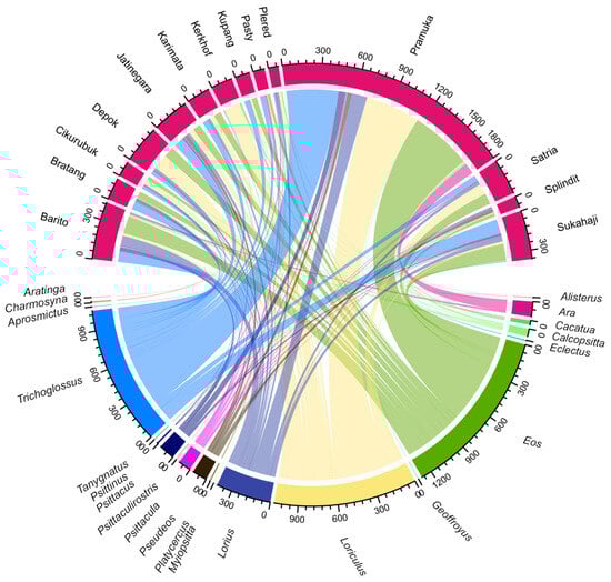 70]. A relevant 84% of the species and 80% of the genera documented in the sampled markets naturally inhabit Indonesia (accounting for 71% of the total individuals recorded). This highlights the profound conservation ramifications of the parrot trade with a substantial impact on Indonesia. The Wallacean parrots, in particular, are among the most threatened globally [