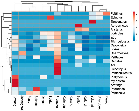 For the heatmap analysis, we created a 14 by 21 presence–absence matrix for the parrot genera and the bird markets. Values were based on the average number of individuals that we observed over the course of the surveys. These values were then used to generate a heatmap using ClustVis [