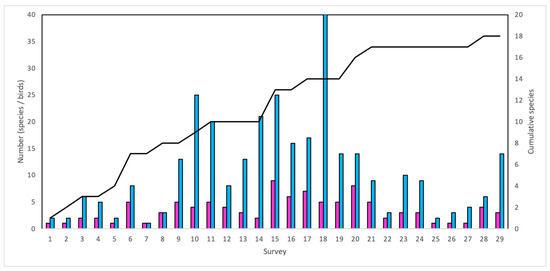 For the temporal analysis, we focused on one bird market, Sukahaji in Bandung, which was surveyed 29 times between 2014 and 2022. For each survey, we tallied the number of species and number of individual parrots. From the second survey onwards, we recorded the number of new species that had not been recorded during previous surveys to arrive at a cumulative number.