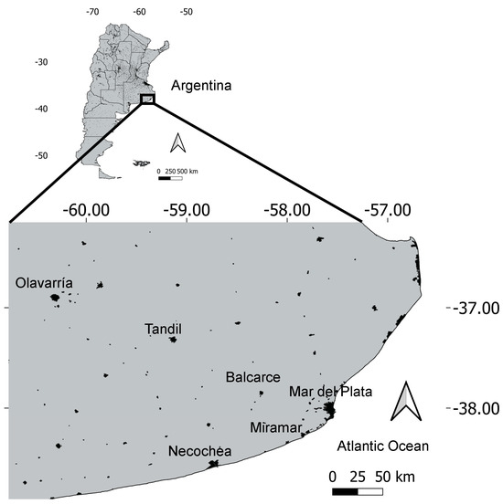Figure 1. Location of the six cities surveyed in east–central Argentina. The dark color indicates the presence of urban areas.