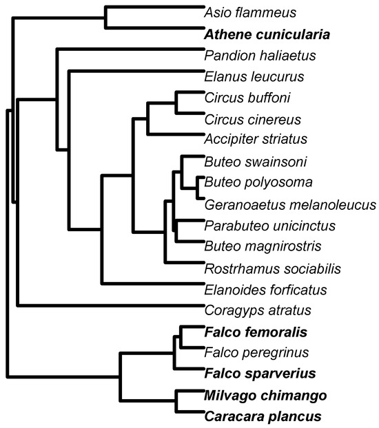 A raptor phylogeny was obtained from the BirdTree database (http://www.birdtree.org, accessed on 27 November 2023; [38]; see Leveau et al. [14]). The Ericson backbone phylogeny was used to obtain 1000 phylogenies [39]. Then, the software TreeAnnotator was used to obtain a 50% majority-rule consensus tree [40]. The functions read.nexus and as.phylo of the ape package were used to open the tree in R [41].