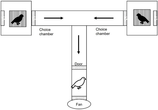 The experiments were performed in May 2017, during the breeding period, in an olfactometry chamber under indoor conditions (temperature maintained at 23 °C, natural light provided by a window). The device was T-shaped (Figure 1) and built with PVC tubes (40 m diameter). It was composed of a central tube (25 cm in length) where the experimental bird was introduced. The central tube had a door located 15 cm from the entrance. The door was built with methacrylate and had small holes to allow airflow. The central tube was connected to two lateral tubes (25 cm in length), referred to as the choice chambers. The choice tubes were connected to plastic opaque boxes (30 × 25 × 25 cm) that contained two little cages (13.4 × 23.5 × 19.8 cm) where the scent donor birds were situated. Overall, the device was sealed, and only openings at the farthest walls of the plastic boxes allowed airflow. The central tube contained a small 12 V PC fan at the entrance door that extracted the air from the device, creating a controlled low-noise airflow. The fan created two constant airflows, each entering across the openings located at the farthest walls of each plastic box containing the scent donor birds, passing by the donor birds, crossing the central tube, and going outside from the device through the fan. Thus, the focal bird received two separate airflows, each carrying the scent of the corresponding donor bird. Donor birds were kept in darkness in opaque boxes for the entire trial duration and housed in reduced space (scent donor cages), restricting movement and vocalizations; thus, scent donor birds did not emit any noise. Therefore, the experimental birds only perceived the scent of the donor birds, without visual or acoustic contact. The experimental room was sealed from exterior noise, enabling the experimenter to perceive any acoustic signals from the focal and scent donor birds in the device. The experimenter was present during the entire trial period but was not visible/audible to the focal bird. Similar devices and methodologies have been successfully used in social context studies [17,39,41,50,51,52].