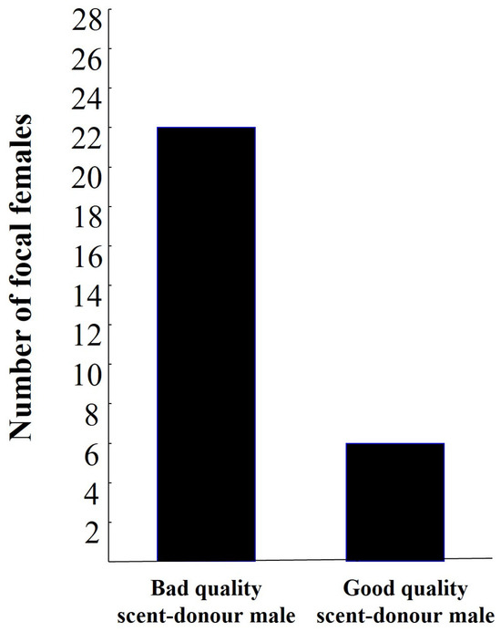 The difference in quality between the two scent donor birds influenced the choice of focal birds (Wald stat = 4.84, df = 1, p = 0.03, Table S1). Most females (20/28) avoided the scent of a potential partner with higher quality, i.e., with a better body condition (Figure 2). The choice of females was not affected by the side of the chamber where the better male was located (Wald stat = 0.69, df = 1, p = 0.41).