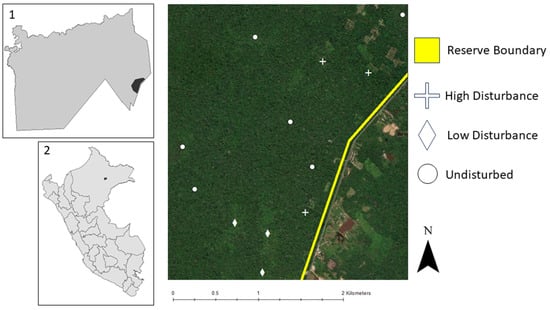 The location of the study sites in Allpahuayo-Mishana National Reserve, where data were collected from March to May 2023. The study sites included 3 low-disturbance (selectively logged) areas, three high-disturbance (former agriculture) areas, and six undisturbed primary forest sites. Inset 1 shows the location of the study area in Allpahuayo-Mishana National Reserve. Inset 2 shows the location of Allpahuayo-Mishana National Reserve in Peru. Imagery source: ESRI/Maxar; imagery date: 6 September 2018.