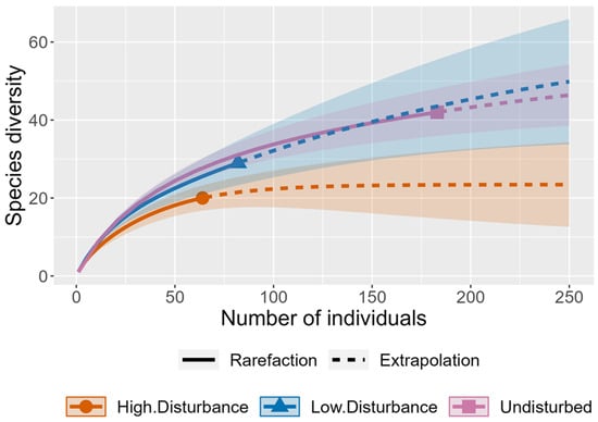 We estimated differences in bird species richness between forest types (low-disturbance, high-disturbance, or undisturbed forests) by combining bird capture data among sites within each forest type and constructing species accumulation curves (SACs) using the iNEXT package version 3.0.0 [46]. SACs in iNEXT use rarefaction and extrapolation of observed capture data to predict the growth of species richness as sample size increases. We chose this method instead of the species richness estimators in SpadeR because SACs are more appropriate for unbalanced study designs, as the rarefaction and extrapolation process effectively standardizes sample size across treatments.