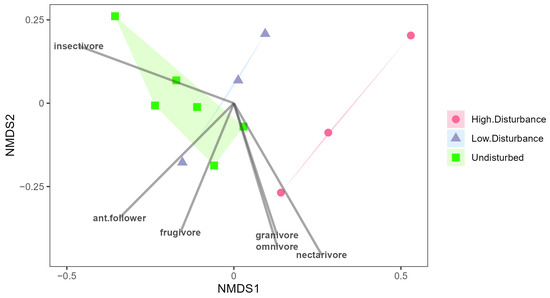 Species accumulation curves calculated for the three disturbance intensities indicated that low-disturbance and undisturbed forest sites had similar species richness, though the species richness of high-disturbance sites was significantly lower (Figure 2). The PERMANOVA analyses confirmed that bird communities differed significantly between disturbance intensities, both when examining bird communities at the species level (F2,9 = 2.42, p < 0.01, R2 = 0.35) and at the guild level (F2,9 = 2.59, p = 0.025, R2 = 0.37). Both PERMANOVAs met the assumption of homogeneity of dispersion (species: F2,9 = 0.19, p = 0.84; guild: F2,9 = 0.15, p = 0.86). The NMDS revealed that differences in community composition among groups were primarily driven by the high-disturbance sites, which contained relatively more nectarivores and fewer insectivores and ant-followers than low-disturbance or undisturbed forest sites (Figure 3).