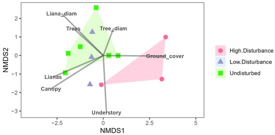 Non-metric multidimensional scaling (NMDS) plot showing differences in forest vegetation structure between high-disturbance, low-disturbance, and undisturbed forest sites in Allpahuayo-Mishana National Reserve, Peru. Each site is represented by a point on the plot, with closer points being more similar in forest structure. The gray lines show the relationship between vegetation structure variables and the two NMDS axes.