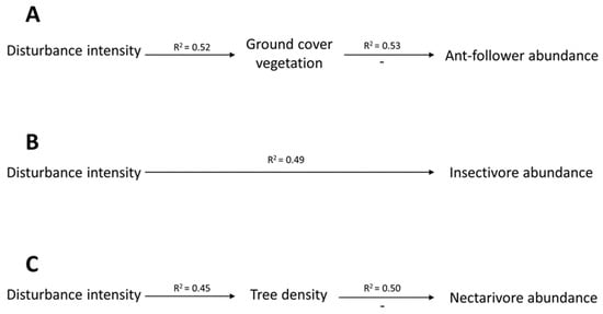 We used structural equation models to examine whether the impacts of disturbance intensity on bird community composition (represented by guild abundance) were mediated through changes in vegetation structure. The ant-follower model described the effects of disturbance intensity on ant-followers as fully mediated by changes in ground cover vegetation (Figure 5A), which was negatively related to ant-follower abundance (β = −0.73). The insectivore model suggested that the effects of disturbance intensity on insectivores were not mediated through any vegetation structure variable that we considered (Figure 5B), and the nectarivore model indicated that the effects of disturbance intensity on nectarivores were fully mediated through changes in tree density (Figure 5C). Tree density was negatively related to nectarivore abundance (β = −0.71). All three final SEMs displayed appropriate goodness-of-fit (p > 0.1 for all models).