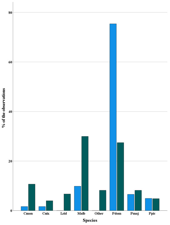 Figure 2. Proportion (%) of species of the total number of foraging observations (n = 61; blue bars) and of the total numbers of birds observed (n = 477; green bars) in the urban parking areas in Rovaniemi, Finland. Cmon = Corvus monedula, Cnix = Corvus cornix, Lrid = Larus ridibundus, Malb = Motacilla alba, Pdom = Passer domesticus, Pmaj = Parus major, Ppic = Pica pica, and other = sum of the following other species (Apus apus, Carduelis chloris, Cyanistes caeruleus, Columba livia, Corvus corax, Delichon urbica, Fringilla coelebs, Hirundo rustica, Larus canus, Motacilla flava, Passer montanus, Turdus iliacus, and Turdus pilaris).