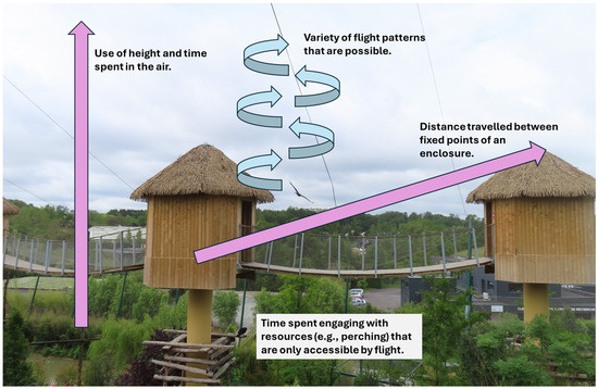 Animals in zoological collections are managed within environments that are completely created by humans. A consequence of this is that there are some constraints on behaviour patterns or restrictions to time-activity budgets. For most zoo-housed animals, there will likely be a compromise between the logistics of managing the species and enabling the widest possible diversity of ecologically relevant behaviours. Whilst restriction on some behavioural performance may be a given, any compromise to welfare does not need to be. Ensuring complexity within an enclosure promotes behavioural diversity [1,2], which can uphold positive welfare outputs [3]. Aligning the complexity of an enclosure with elements of a species’ ecology, therefore, provides for key behavioural needs and ensures the long-term relevance and currency of a zoo’s exhibits. It is also important to remember that free-living animals in natural systems are not removed from restrictions to behavioural performance. Home range or territory sizes, competition from other animals, resource allocation and distribution, predation, disease, and social system will all restrict what animals can do at a specific time and place [4]. Our understanding of how animals can be behaviourally flexible to cope with such pressures is the essential information needed when evolving the design and format of captive management regimes. As we use an evidence-based approach to design and implement housing and husbandry [5,6], we can be more assured of the suitability of animal management regimes for the species that they are applied. Evidence can be gathered by using pre-existing concepts such as Tinbergen’s Four Questions [7] and applying the questions of causation, development, function and evolution to wild behaviours and captive time budgets to evaluate why and how behaviour is performed, and what the animal gains from it [8,9]. However, there are still key areas of species’ ecology that we do not fully understand and therefore our care for these species in ex situ populations is a compromise. One such example of this ecological “grey area” is whether birds like to fly.