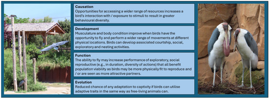 We could consider the previously mentioned Tinbergian approach to unpick the effect of different situations that a species is housed in and what the result of a lack of flight, or promotion of flight may be to the population in the zoo overall. Figure 3 suggests a Tinbergian framework in the manner of Mellor et al. [28] for assessing improvements to behaviour and welfare for birds that are commonly housed in a flight-restricted manner (e.g., feather-trimmed or in aviaries of a size that do not allow for meaningful flight), in this case, Marabou (Leptoptilos crumenifer). Opportunities for flight may enhance engagement with causal factors for a wider range of behaviours because birds can explore different resources or enclosure dimensions when flying. Birds will also develop physically when flight is possible and this may impact their abilities to perform other behaviours in a more species-typical manner. As changes to bird morphology can occur that are suggestive of adaptation to captivity [55], enhancing abilities to fly (such as by providing more space via the construction of larger aviaries) can ensure that wild traits are conserved in ex situ populations. Alongside this, consideration should then be given to the style and structure of perching within an aviary. Birds that are travelling for longer times in the air may require perches of different flexibility than when housed in aviaries where the bird is airborne for much shorter periods of time. As the style of perching (its diameter, uniformity, rigidity, and location) will impact bird foot health [56], perches may need to become more species-specific as aviary design enables more opportunities for prolonged flight.