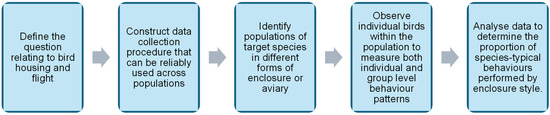 There is evidence that welfare is not compromised by flight restraint for some captive species when measured using comparative behavioural approaches [57] and physiological indicators [58,59]. Consequently, data need to be collected across facilities to fully understand how individuals within a species respond to different forms of enclosure (covered aviary or open-topped) as well as shape and size (length, height). As different populations of the same species of bird can show behavioural flexibility based on environmental challenges, e.g., different organisation of migration affectivity by whooper swans that breed at higher or lower altitudes [60], it is important to consider the origin of bird populations in zoos and what challenges they may be capable of adapting to or coping with. This may, in turn, have an impact on the amount of flight seen in zoo housing. Figure 4 provides a schematic representation of how research questions could be implemented to collect such comparative data.
