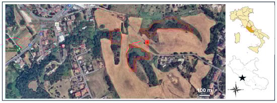 The study area, with a total extent of 38 hectares, consists of a residual corridor of the Roman countryside (‘Campagna Romana’; southwestern Rome suburban area), located between two nature reserves: “Valle dei Casali” and “Tenuta dei Massimi” (Latium Regional law n. 29/1997; size area: 38 hectares; 41°51′52.6″ N 12°24′53.6″ E; [35]; Figure 1). This is an agroforest mosaic with a landscape matrix composed of croplands and uncultivated fields dominated by Vulpio-Dasypiretum and Diplotaxio tenuifolii-Agropyretum repentis [36,37,38], including three forest patches (10.05% of the total area) dominated (>76% of tree frequency; n= 349; Supplementary Materials Table S1) by cork oaks (Quercus suber; [39]).