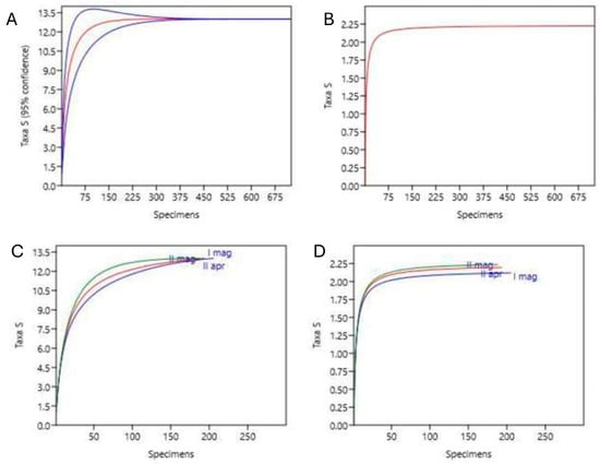 Univariate diversity metrics were then calculated: (i) Shannon–Wiener diversity index (H′; [51]), as H′ = −Σ frD [lnfrD]; (ii) evenness index (J; [52]), as J = H′/H′max, where H′max = lnS (with S = number of detected species); and (iii) normalized Margalef richness (Dm; [53]), as Dm = (S−1)/lnN.