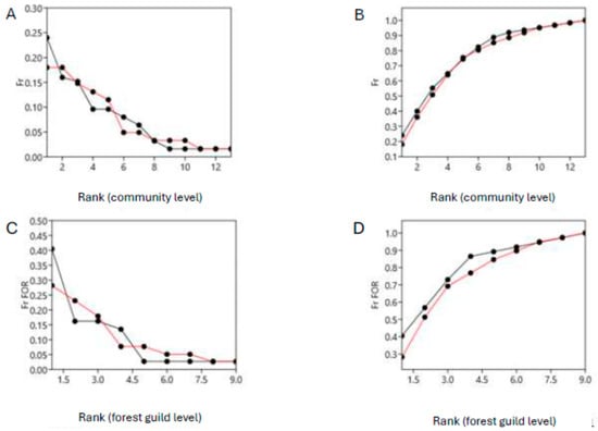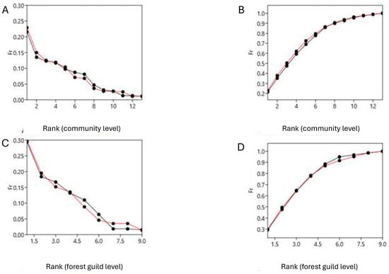 Whittaker (left) and k-dominance plots (right) made by comparing frequencies derived from the ecological densities of the entire bird community (above) and forest guild (below) before (2018, lines in black) and after (2023, lines in red) the fire event (July 2022). (A,B): respectively, Whittaker plots and k-dominance plots for the entire bird community; (C,D): respectively, Whittaker plots and k-dominance plots for the forest guild.