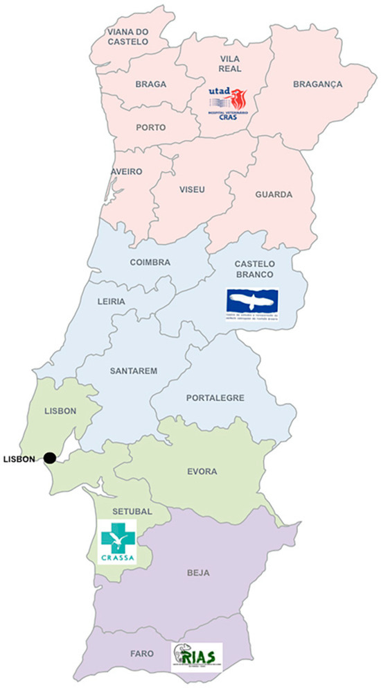 Location and operating areas of the four recovery centers on continental Portugal that provided data for this study (CRAS-UTAD: red, CERAS: blue, CRASSA: green, and RIAS: violet).