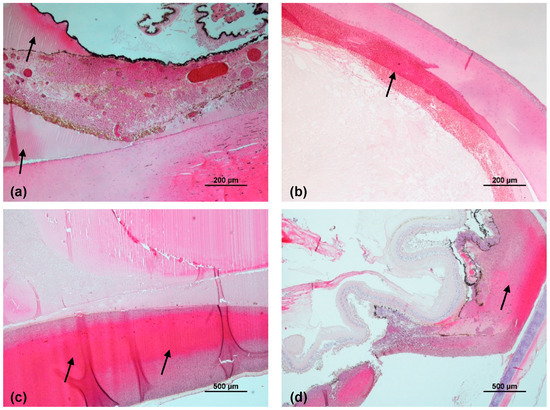 Microscopic images of the eye of a Eurasian Buzzard (Buteo buteo) stained with hematoxylin and eosin. Hemorrhage (black arrows) is present in the anterior chamber (a,b), as well as in the posterior chamber (c,d). Notice the retinal detachment (d) and hemorrhage also present in the subretinal and choroid space.