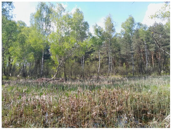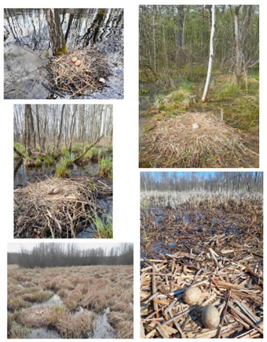 Though an eclectic species, the Crane actually has quite specific habitat requirements. Optimum patches of habitat are very limited in area, isolated, and scattered all over its breeding grounds. In Poland, it prefers postglacial landscapes with large numbers of lakes, moraines, pools of water, and peat bogs (Figure 1) [7,24]. It builds its nests within a broad spectrum of diverse wetland habitats [25,26,27,28,29,30]. The nest platform is usually constructed from plants growing in the immediate vicinity (Figure 3) [7,8]. On the Elbląg Upland, Cranes nested in forests (89%, including 73% in alder swamps) and less often in open terrain (11%) [9]. Birds nesting on open ground usually do so on drained peat bogs (often crisscrossed by drainage ditches), overgrown meadows, sedge fields, reed beds, and peat workings. In the Polesie National Park in 2005–2006, most pairs (47%) nested in alder swamps and marshy birch woodland, 26% in waterlogged meadows, 21% on peat bogs, and 6% in other habitats [18]. In Lublin Province, in 2022, 67% of pairs nested in forests and 33% in open landscapes [8]. All the nests in this region had been built in depressions in the terrain with a water surface that did not dry out at any time during the breeding season. The birds choose tranquil sites for their nests, usually remote from any human habitations. On the Elbląg Upland, Crane nests were situated 50–1800 m (av. 885 m) from a tarred road and 150–1400 m (av. 680 m) from buildings [9]. In the Lublin region, the corresponding figures were of a similar magnitude: the distance between a nest and a tarred road was 93–1180 m (av. 553 m; SD = 321.3 m), while that between a nest and an inhabited building was 219–1470 m (av. 746 m; SD = 385.7 m) [8]. However, in northern and western Poland, the part of the country with the greatest abundance of Cranes [14,26], where there is stiff competition for nesting sites, these birds sometimes choose highly unusual spots to nest in—close to lightly trafficked roads, railway lines, or inhabited buildings, to name but a few examples.