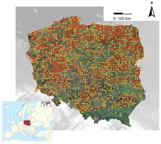 The breeding distribution of the Common Crane (years 2015–2024) in a grid of 10 × 10 km (N = 2251) squares in Poland. Yellow circles—possible breeding (e.g., one individual, a pair observed outside nesting habitat; N = 323 squares); orange circles—probable breeding (e.g., a pair observed in suitable nesting habitat; copulation and display; N = 1137); red circles—confirmed breeding (e.g., nest with nestlings or eggs found; flightless fledglings; N = 791); 1—one record; dark green color—forests, light green color—open areas [14,16].