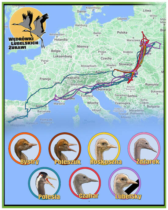 The spring and autumn migration routes of seven young Common Cranes tagged with GPS/GSM transmitters in the Lublin part of Polesie (eastern Poland) in 2021–2023. The different colors indicate migration routes of ringed individuals with Polish names.
