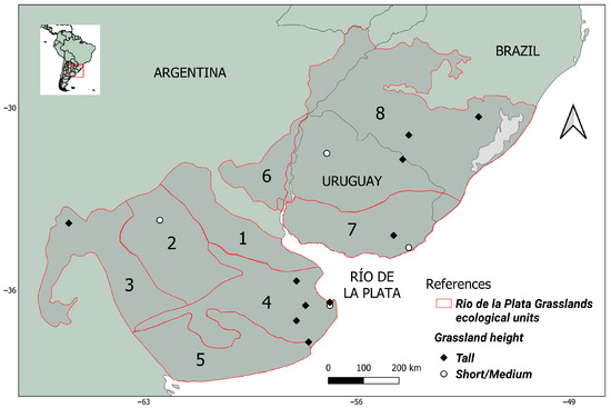 Río de la Plata Grasslands [3] with the location of the case studies included in the meta-analysis (black diamonds for tall grasslands and white circles for short/medium grasslands) and the ecological units (red lines). Ecological units: (1) Rolling Pampas; (2) Flat Inland Pampas; (3) West Inland Pampas; (4) Flooding Pampas; (5) Southern Pampas; (6) Mesopotamic Pampas; (7) Southern Campos, and (8) Northern Campos.
