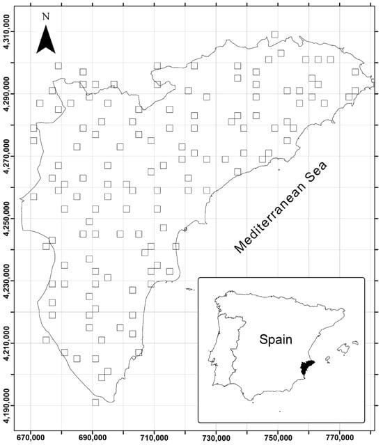 Map of Alicante province and its location in SE Spain. The 10 × 10-km UTM grid is shown (thin line) along with the 2 × 2 squares that were randomly selected for the fieldwork of the Atlas of Breeding Birds in the Province of Alicante [,].