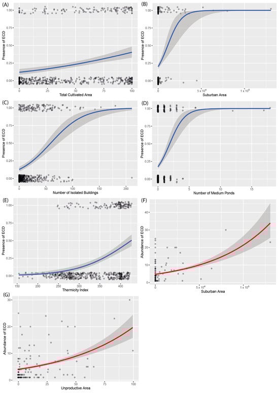 Relationships of the most relevant environmental variables, according to the HP analyses, showing a positive relationship for the presence (blue line: (A–E)) and abundance (red line: (F,G)) of the Eurasian Collared Dove in SE Spain.