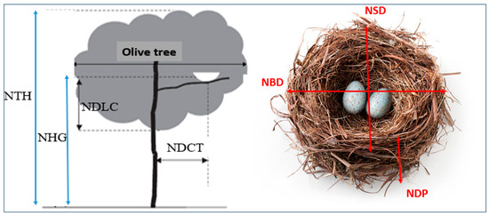 Nesting parameters on olive trees (NBD: big diameter; NDCT: distances separating the nest from the central trunk; NDLC: lower canopy; NDP: nest cup depth; NHG: the height of the nest from the ground; NTH: the height of the olive tree with a nest; NSD: small axis).