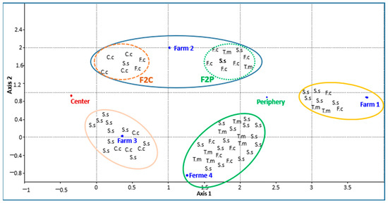 Placement of nests in the four studied olive farms ((C.c: European Greenfinch (C. Chloris), F.c: Common Chaffinch (F. Coelebs), S.s: European Serin (S. serinus), and T.m: Eurasian Blackbird (T. merula)) analyzed with DCA.