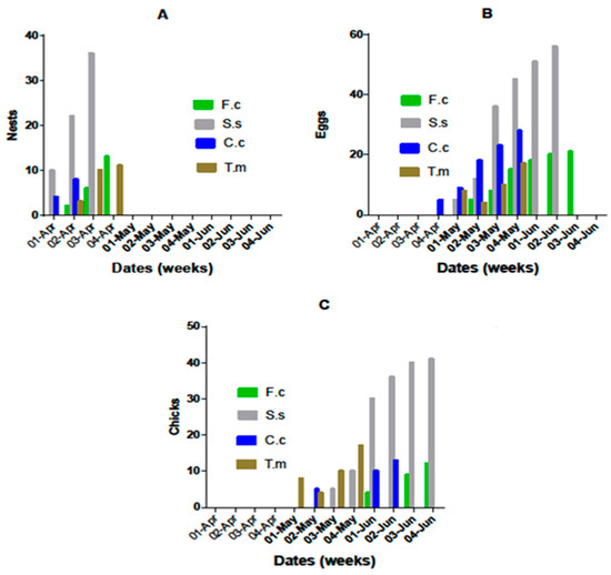 Breeding phenology (nesting, eggs’ laying, and hatching dates) of Eurasian Blackbird, European Greenfinch, Common Chaffinch, and European Serin in Saiss plain between 2018 and 2019 (C.c: European Greenfinch (C. Chloris), F.c: Common Chaffinch (F. Coelebs), S.s: European Serin (S. serinus), and T.m: Eurasian Blackbird (T. merula) and Breeding Phases: (A) Nesting, (B) Laying, (C) Hatching).