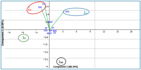 Main principal factors (CD: Death of nestlings; CDS: Desertion of nestlings; EDST: Destruction of nests and eggs; EDS: Desertion of nests with eggs; EP: Predation of Eggs; EPO: Poaching of eggs; EU: Abortion of eggs; NDS: Desertion of nests; NDST: Destruction of nests; and NP: Predation of nests) affecting breeding performance of studied species (C.c: European Greenfinch (C. Chloris), F.c: Common Chaffinch (F. Coelebs), S.s: European Serin (S. serinus), and T.m: Eurasian Blackbird (T. merula)) analyzed with PCA.