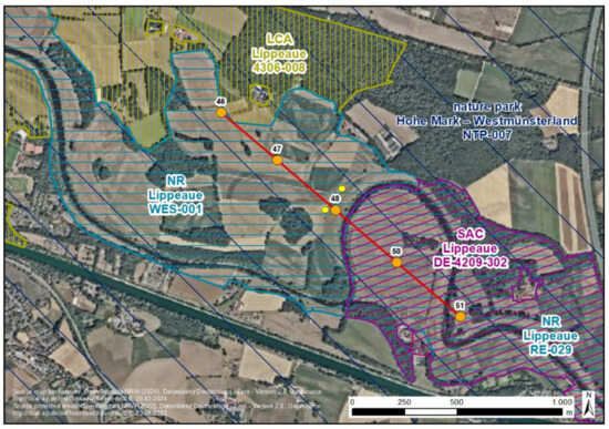 The powerline section investigated crossed the districts of Wesel and Recklinghausen and was located south of the municipality of Schermbeck and west of the city of Dorsten in North Rhine-Westphalia. The powerline section was almost completely located in the nature reserve ‘Lippeaue’ (WES-001/RE-029), which also includes the special area of conservation (SAC) ‘Lippeaue’ (DE-4209-302) in the eastern part of the study area. While the powerline section lay entirely within the Hohe Mark-Westmünsterland Nature Park (NTP-007), the ‘Lippeaue’ landscape conservation area (LSG-4306-0008) was crossed exclusively between pylons 46 and 47 (Figure 1).