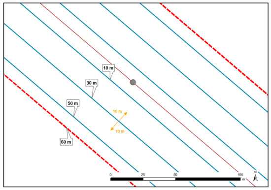 Six transects, each 20 m wide, were surveyed under and next to the overhead powerlines spanning pylons 46–51 (Figure 1). A transect width of 20 m provided the best results in terms of effort versus search success ratio [9,10]. Furthermore, our own experiences and those of Jödicke et al. [10] showed that, e.g., for a 380 kV powerline with a crossbeam width of about 30 m, >90% of collision victims are found within a 120 m survey corridor. Searches within a transect followed a central line, with two 10 m-strips searched on each side of the line (Figure 2). The search speed was approximately 2 km/hr, based on the findings of Jödicke et al. [10] and our own experience. The survey covered approximately 1.5 km of the line (pylons 46–51, Figure 1), accounting in total for 9 km and 4.5 h of search effort. A total number of 88 collision victim searches were conducted.